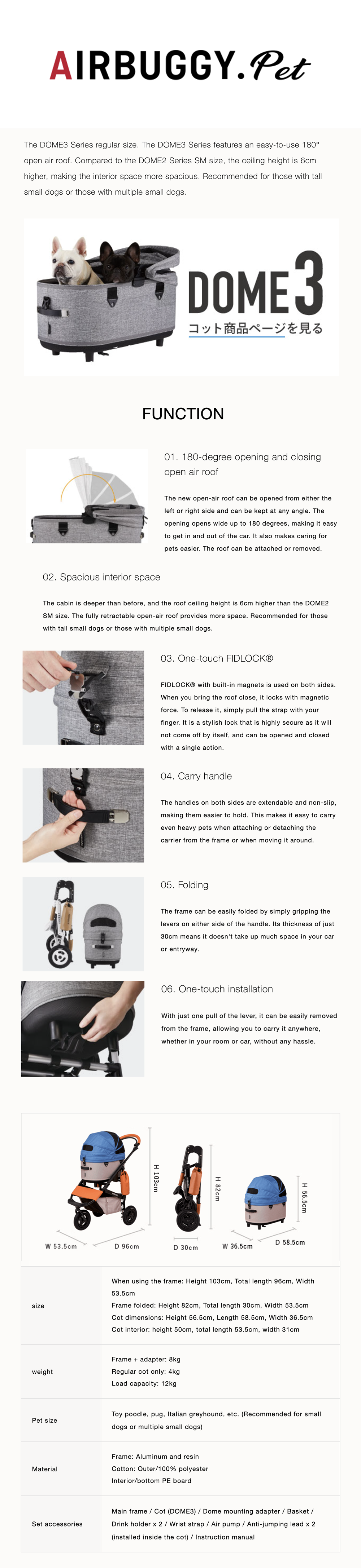 The AirBuggy DOME3 Large Set is a stylish and functional pet stroller designed for everyday adventures. With a spacious dome, smooth-rolling wheels, and a sturdy frame, it ensures a comfortable and secure ride for your pet.